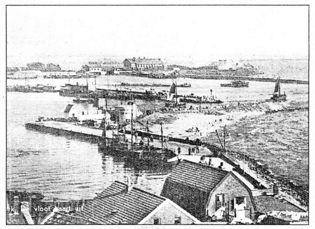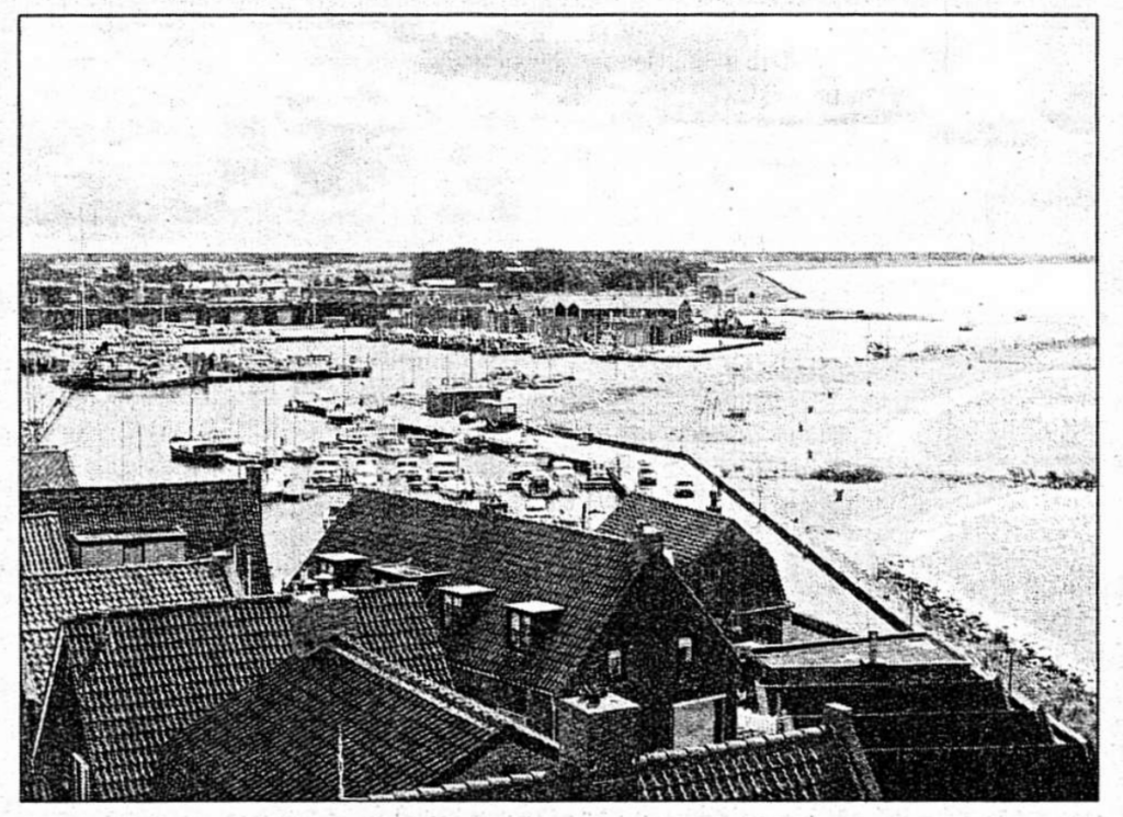 Volgens de ons verstrekte gegevens zou deze foto omstreeks 1946 genomen zijn. Op de ‘Kamperdijk’ lagen nog tonnen en tonnen puin van Rotterdam. Dat puin werd al snel na het bombardement van die stad in de meidagen van 1940 gestort op de beide meerdijken nabij Urk en op de Rotterdamse Hoek halverwege Lemmer. Jan de Wit, nu in Canada, vond tussen dat puin een beeld, dat hij naar Urk probeerde te sjouwen. Het was natuurlijk geen doen voor de jonge Jan en hij moest het na enkele kilometers opgeven, dumpen dus. Later zagen we het beeld terug in museum Schokland met het onderschrift: ‘Romeins beeldhouwwerk, gevonden ten Oosten van Urk’. “Ze kunnen alles wel beweren”, zei Jan toen, “maar dat is meen bield in et is zeuver Rotterdams.” Op de foto is het hoogzomer, veel jeugdige badgasten zijn er op het strand te zien. In die tijd lag er een scheepswrak voor het ‘kleine strandje’, ook al een oorlogssouvenir. Naar ik meen was de naam van de klipper ‘Spes Salutis’. De kop van het schip werd als duikplank gebruikt. Het leverde Koos van Wijk later een gewonde voet op. Een sleepboot verlaat de haven met een ‘bak’ van de Zuiderzeewerken. Woonarken van opzichters en ingenieurs liggen nog in de haven, van waaruit enkele bottertjes vertrekken om hun geluk te beproeven in de hoop op enkele ‘wichies’ van die kostelijke lJsselmeerpaling. Een ‘wichien’ was meen ik honderd pond. Als je, zoals ik, de zoon was van een IJsselmeervisser, mocht je in de vakantie wel eens met vader mee, zee op. Een hele belevenis, vooral als je op ontdekkingereis zo’n mooie Staverse boot tegenkwam, sierlijke zwanen met eerste, tweede en derde klas en met een schoorsteen in dat onbestemde geel met aan de bovenkant een brede zwarte rand. Ach, die laatsten der Mohicanen. ‘C. Bosman, W.F. van der Wijck, R. van Hasselt, zo heetten ze. Prachtige boten waren dat. In de nadagen van het spoorwegveer heeft onze eigen ‘Insula’ de dienst nog gevaren, Enkhuizen – Stavoren vice versa. Dat ouwe Rijnstomertje was natuurlijk geen partij op die illustere lijn.